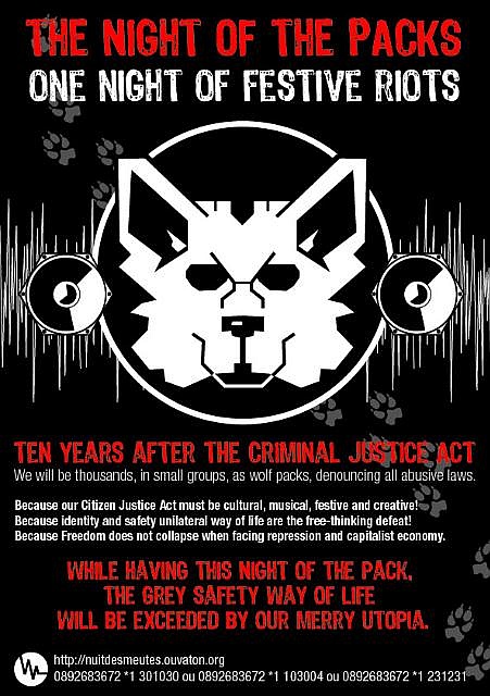 Připomeňme si výročí 10 let po ?Criminal Justice Act? v Anglii a ?Loi Marianni? ve Francii! Budou nás tisíce, v malých skupinách, jako vlčí smečky, veřejně odsoudíme všechny represivní zákony!